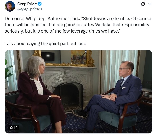 By Craig Bannister, Media Research Center – In a viral video, Democrat Whip Rep. Katherine Clark (D-MA) says that, while Democrats’ government shutdown will cause American families to suffer, it’s worth it because it gives her party leverage to pass its political agenda… “Utterly shameful! The Democrats OPENLY ADMIT they are causing the shutdown—and using hardworking American families as their LEVERAGE,” House Speaker Mike Johnson (R-LA) wrote Wednesday, responding to a social media post of Clark’s statement.