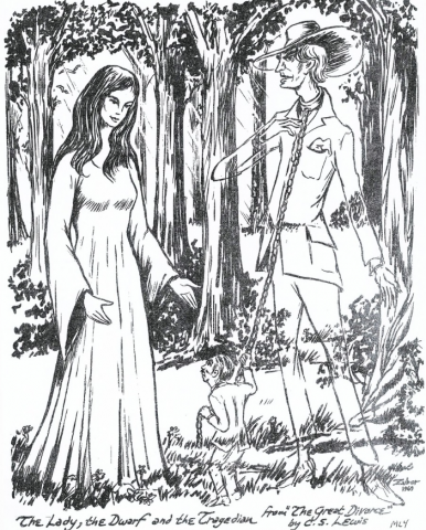 Screenshot . “The Lady, the Dwarf, and the Tragedian” from C.S. Lewis’ The Great Divorce. Illustrated by Bernie Zuber. SOURCE: The Catholic Thing. March 2025