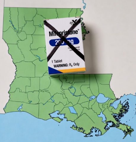 An image by Grok. The state of Louisiana with an image Mifepristone being banned.