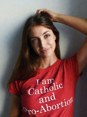 Grok image. Woman wearing a t-shirt, "I am Catholic and Pro-Abortion"