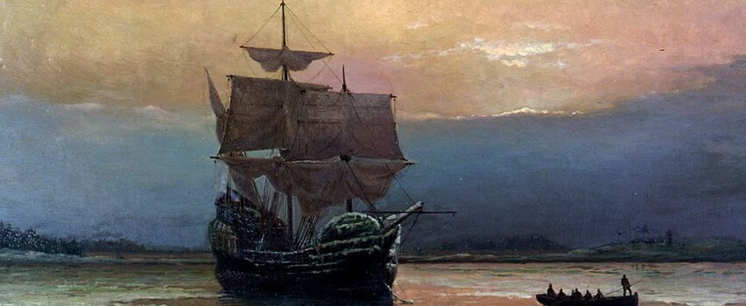 The Mayflower on Her Arrival in Plymouth Harbor’ painting by William Halsall, 1882 (Pilgrim Hall Museum/Wikimedia Commons)