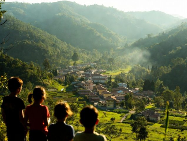 Image by Grok. AI. Children overlooking a small village in a valley, hemmed in by a cashmere blanket of green mountains.